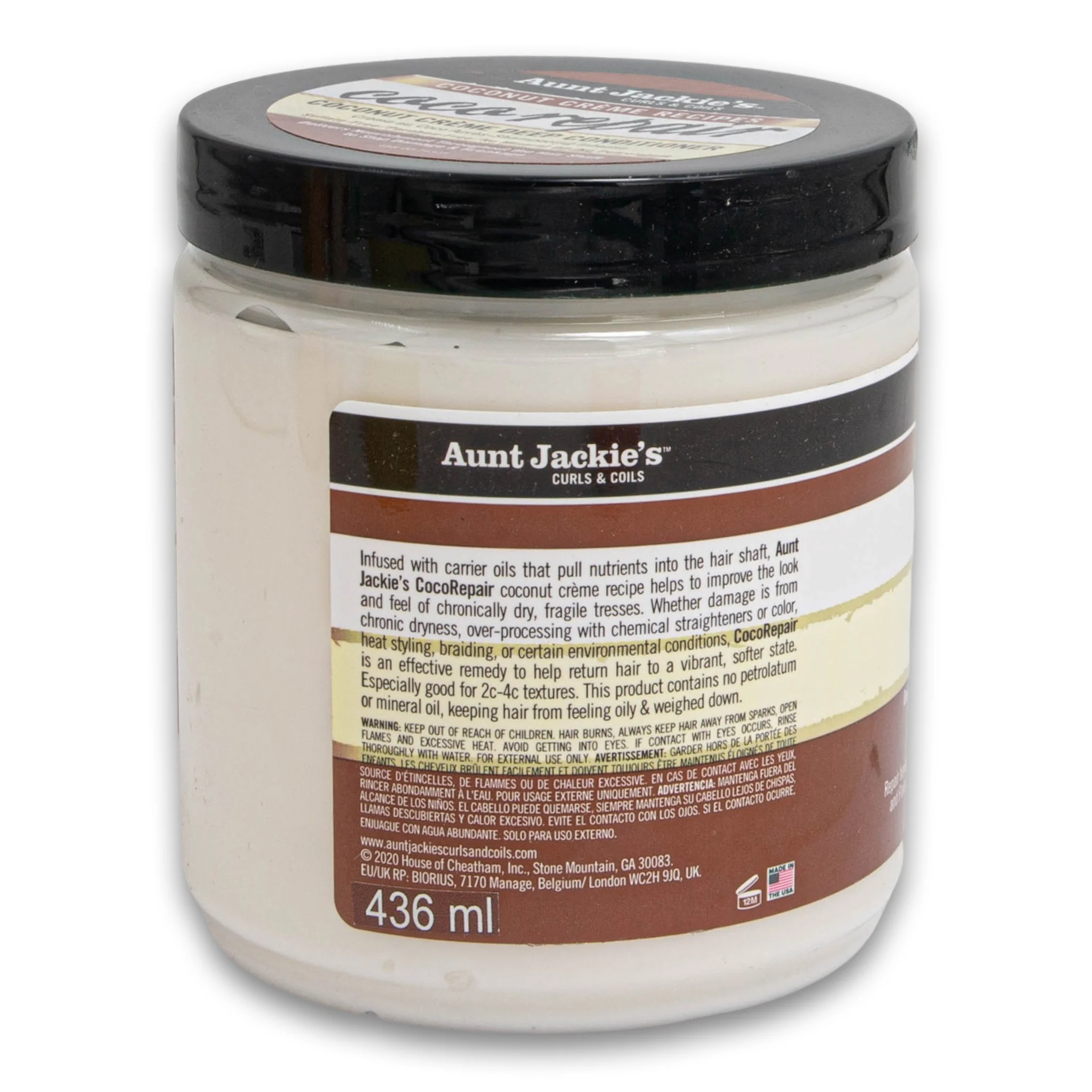 Brand: Aunt Jackie’s | Product Type: Deep Conditioner | Key Ingredients: Coconut Creme | Volume: 436ml | Formulation: Cream | Allergies/Warnings: For external use only, avoid contact with eyes.